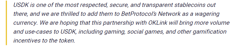 BetProtocol and OKLink have collaborated together to offer USDK stablecoin on BetProtocol as a wagering token. The partnership aims to multiply the number of stablecoins already supported on Betprotocol to four i.e. USDC, Dai, USDT, and USDK now.