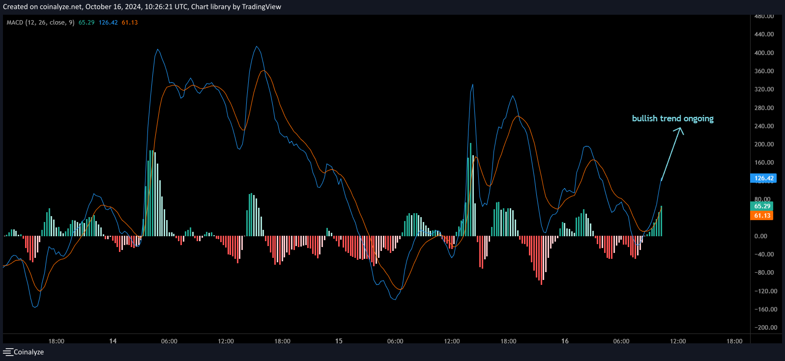 The MACD chart indicates a bullish trend as the MACD line crosses above the signal line. It is further supported by green histogram bars, which show increasing momentum. Based on Bitcoin’s price predictions and the ongoing price action, there is a growing buying pressure in the market, which could lead to further upward movement. Currently, the key psychological level is around 100 (as round numbers often act as a significant point for traders).