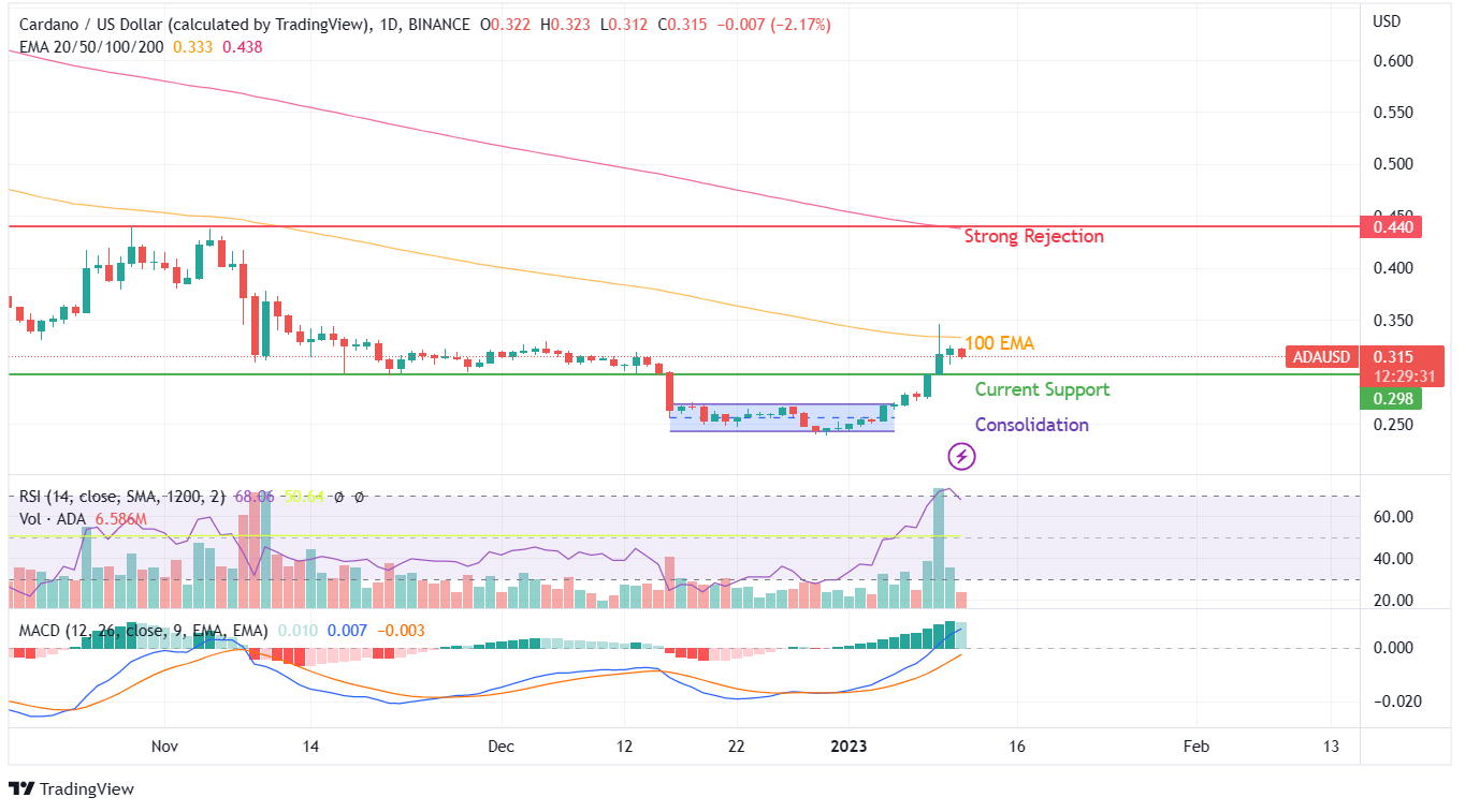 There could be various factors that are contributing to the resistance near the 100 EMA. At the same time, facing difficulty in trading above the 100 EMA may act as a barrier for ADA to reach higher price levels.