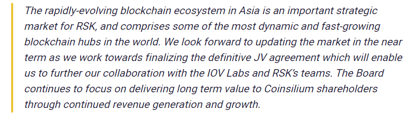 The MOU signed between IOK Labs and Coinsilium allows the creation of a Joint Venture Company focused on the promotion and commercialization of RSK’s services, products, and offerings to the Asian marketspace. The newly constituted firm will lead to RSK’s services proliferation into corporations, governments, NGOs, etc. It will help in lubricating the adoption process of RIF token which lends support to core RSK network, its partners, and developers hailing from around the world.