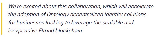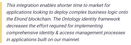 The ONT ID layer will be integrated with the Elrond network, which will allow the users to validate against an application of Elrond using the ID. There will be a streamlined connection between the two blockchains that will allow the transfer of assets between the two decentralized systems. The Elrond developers will have a strong cross-chain system for identity and access mechanisms. They will enter a high potential market of user-centered monetizable data statistics.