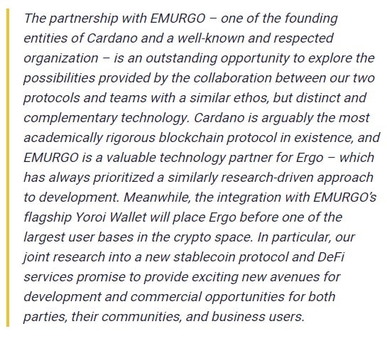 Talking about the partnership, Alexander Chepurnoy, the Ergo Core Developer, stated,