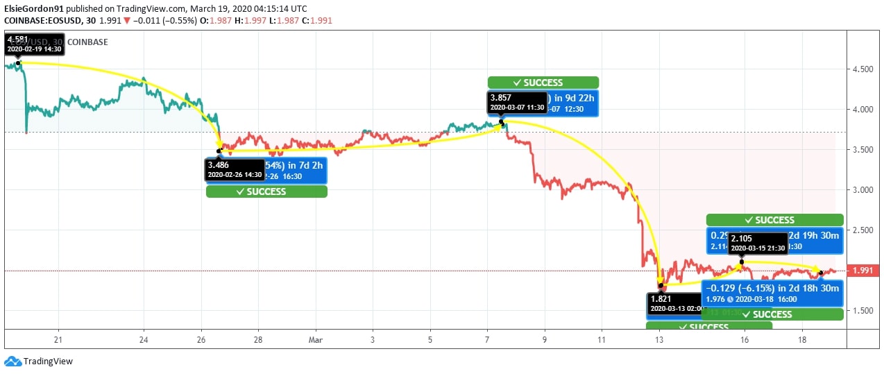 EOS coin has marked strong downside momentum over the past 30-day timeframe. In the last month, on February 19, the coin was trading at a high of $4.581. From this high, the coin fell to $3.486 by a massive fall of 23.54% in the next 7 days, but then, EOS coin marked moderate escalation. Despite the strong bearish undercurrent, the currency managed to take an upward swing and touched $3.857 on March 07 by 9.65% hike. However, after this moderate hike, the bearish pressure started getting stronger, which results in a massive fall of 53% to $1.821 on March 13.