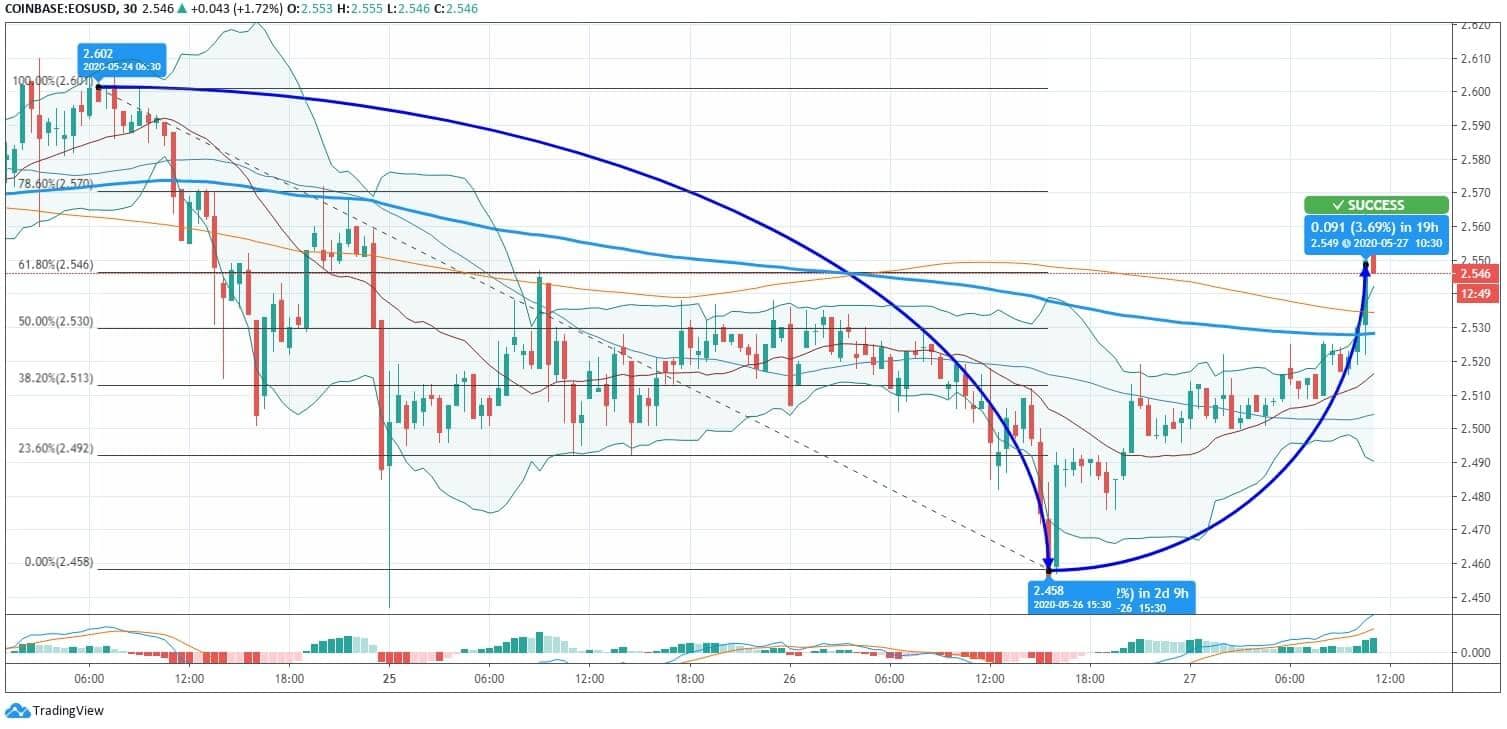 Till yesterday 15:30 UTC, EOS kept consolidating between the 23.60% and 50% fib level. The coin notes $2.64 as its 3-day high price mark. The coin is approaching 78.60% fib level, and the same level may pose as a resistance level.