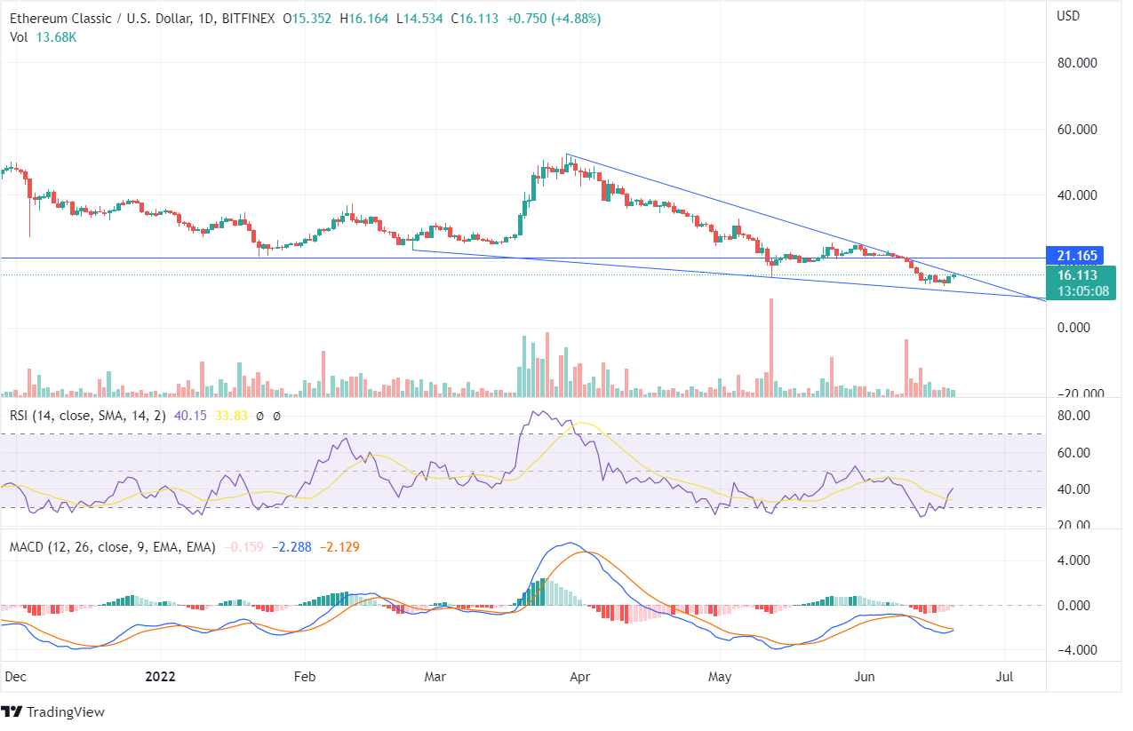 The volume bars show a favorable move toward the bears as the ETC price has been falling drastically. There have been diminishing red candles in the histogram chart, indicating the bullish trend can be upcoming if the Ethereum Classic price reverses from this point.