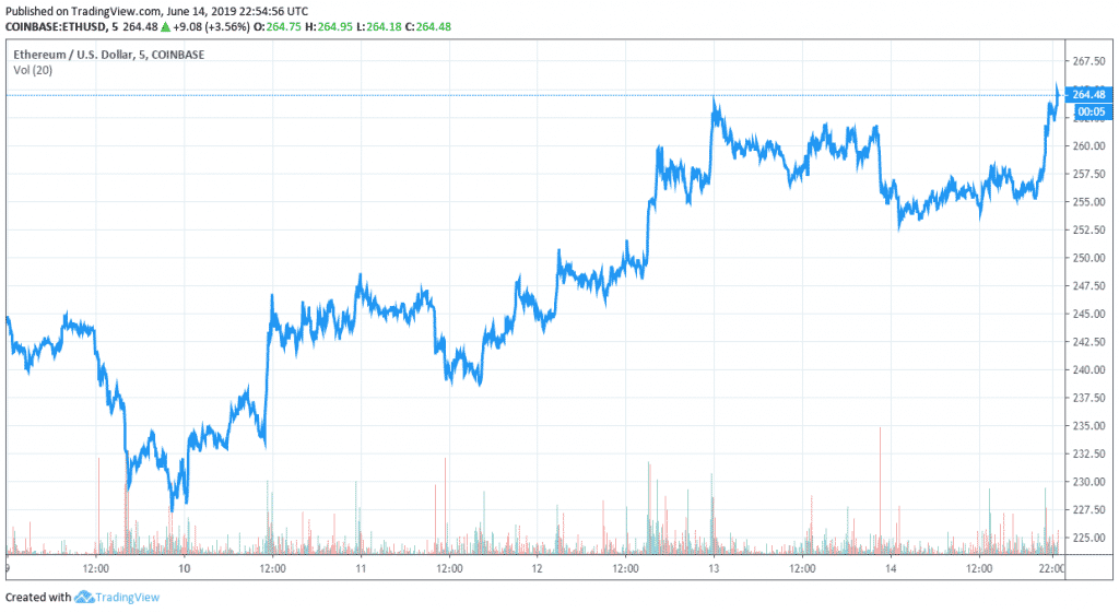 As on June 14, 2019, at 22:54:56 UTC, ETH token is trading at $264.48. There has been an uptrend of over 12% in the last 5 days when the coin value showed a consistent upward movement with few dips and reached as high as $270.14. Currently, it has slowed down a bit, but the week may close on a better note.