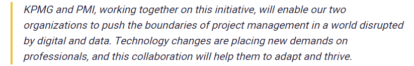 As per the official statement, the elite core team of KPMG will render the PMI members and certification holders to work in a new operational ecosystem as part of the agreement. The integration between the leading organizations will be focused on the development and innovation of new-age technologies such as blockchain, artificial intelligence, internet of things, cloud computing, etc. The emerging technologies will help the platforms in revolutionizing the business processes in a big way.