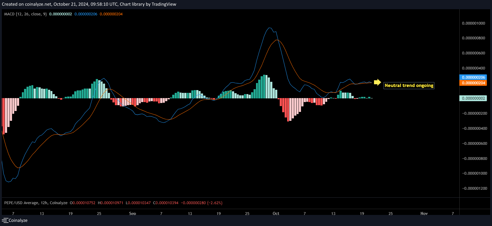 The MACD analysis for PEPE is interesting! The MACD and signal lines converge, and no crossover is seen. The histograms also indicate a flat momentum, with prices remaining stable. In terms of 1000x, there is no hope for it in the short term. However, if PEPE continues to grow annually at its current 638% rate, the token could help investors make a profit in about three and a half years.