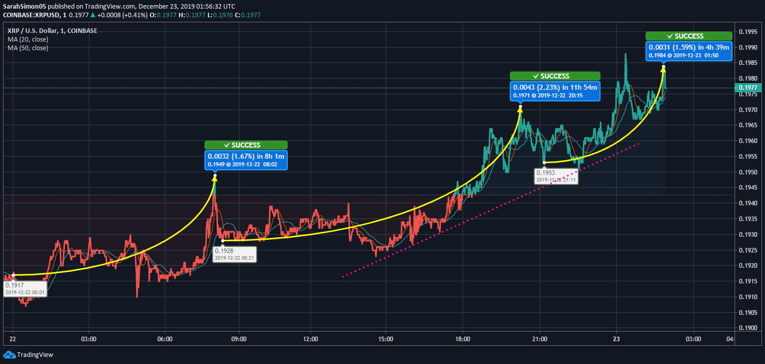 Yesterday, the XRP price spotted at $0.1917 in the first hour, and over the next 8 hours, it managed to show a marginal hike of 1.67% that pushed the price to $0.1949, but, after this hike, it faced a steep fall. And the XRP price fell to $0.1928. From this price point, the currency registered a 2.23% jump that added $0.0043 and helped XRP to confine its price to $0.1971. After this steady hike, the coin marked a slight fall but managed to show signs of strength. By 01:50 UTC, the XRP price reached $0.1984.