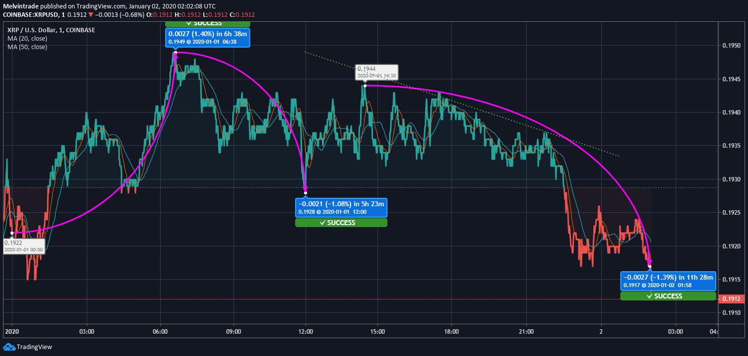 XRP coin started the year with 0.1922 USD and over the initial 6 hours and 40 minutes; it managed to sway away with an uptrend to add 1.40%. This variation pushed the price to the highest point of the day at 0.1949 USD. However, good moments for Ripple were scarce on January 01, 2020. The next swing was a fall of 1.08% that dropped the XRP price to 0.1928 USD by 12:00 UTC. The next few hours were full of price fluctuations and gave nightmares to intraday traders. However, Ripple price stabilized at 0.1944 USD by 14:30 UTC only to find a way through the slope to lose another 1.39%.