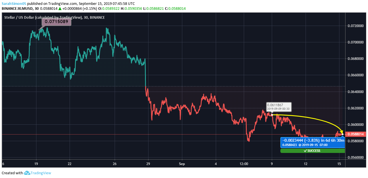 Let’s have a look at the price movement of the XLM coin over a period of 25-days. On August 19, Stellar Lumens was spotted at $0.0715. However, from this price point, its value dipped by a margin of 17.76%. In a week’s trading, the currency broke down by 3.83% from $0.06118 on September 09.