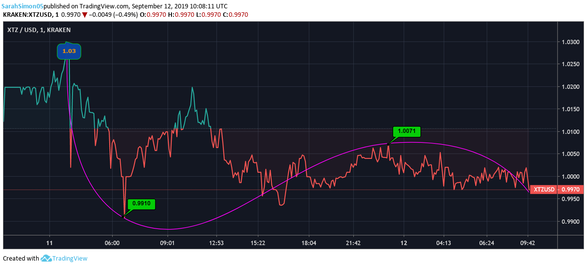 As on September 12, 2019 at 10:08:11 UTC, XTZ is trading at $0.99 and has recorded over 3.8% downtrend since yesterday declining from $1.03 to its current value. The coin was found to be trading around $1 for most of the day yesterday but took a dip suddenly to hit as low as $0.99. It may rise upto $1 in the next few hours.