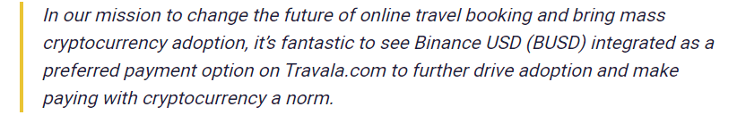 Travala.com is adding Binance stablecoin BUSD which enables the customers to make payments for hotel bookings from Travala.com. Travala.com is spread across 230 countries and territories and covers 2 million hotels and accommodations.
