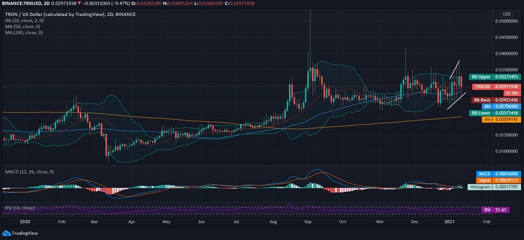 At the press time, TRON was seen trading at $0.0297 after forming a bullish candle from the weekly lows of $0.0277. However, the coin draws an ascending price channel since the beginning of the ongoing year and is, therefore, retaining support on the 2-day chart at two key levels, i.e., $0.0279 and $0.0205.