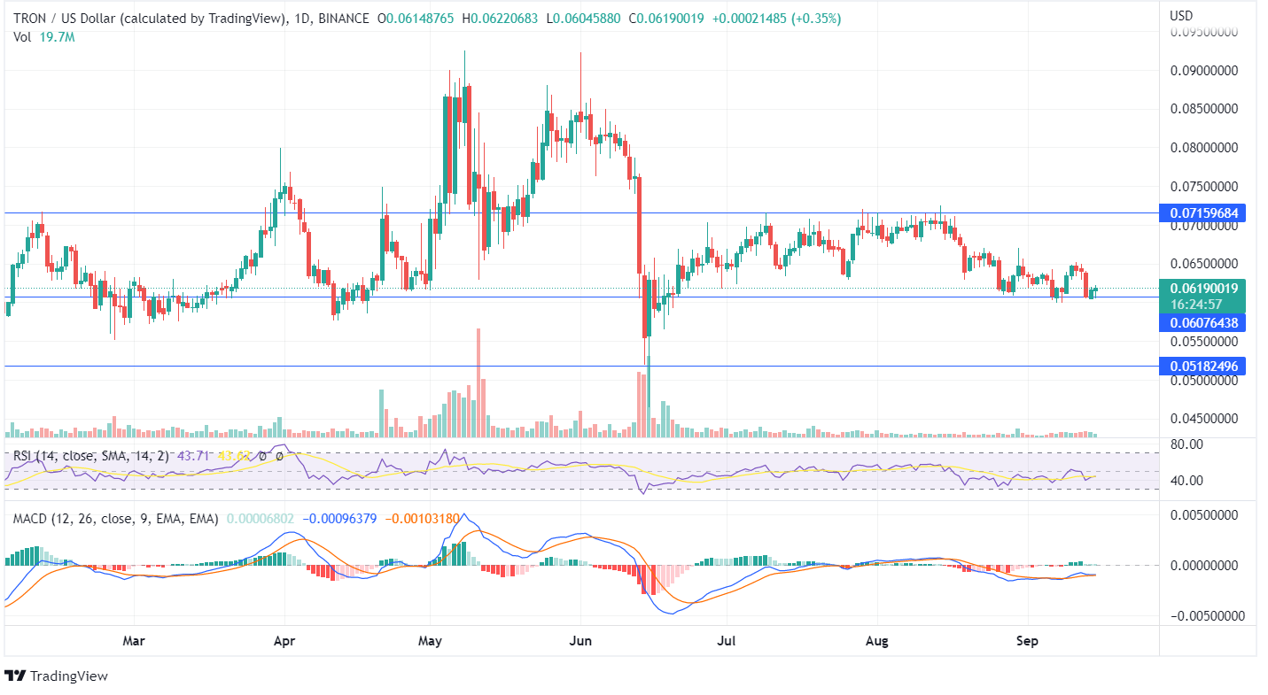 TRON moves sideways as the price turns from its lower zone with the current trade value of $0.0619. TRX coin has been showing consolidated momentum with little movement in its price. The token has been moving between $0.071 and $0.060 for the past few weeks. This indicates that the bulls or bears are unable to close the price above or below the resistance or support line.