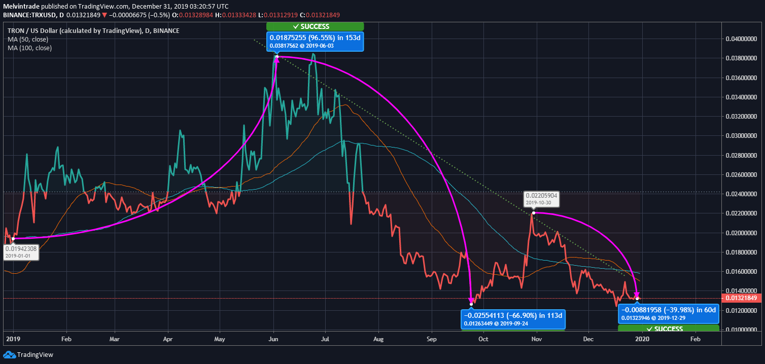 TRX coin started growing right at the starting of 2019. From January 01 to June 03, Tron cryptocurrency managed a 96.55% hike that added 0.018752 USD to the value. However, owing to the devastation in the market in June, Tron’s price started falling. It got to the abysmal low at 0.012634 USD by September 24. The next few days saw little growth in the value to find a fall again. The last major swing happened between October 30 and December 29. In these 60 days, the Tron coin lost 39.98% value to touch 0.01323 USD.