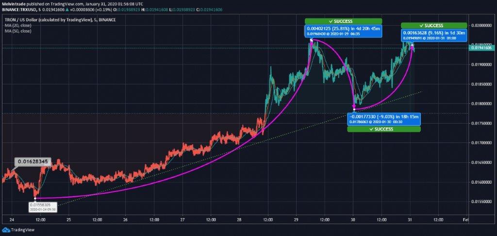 On January 24, TRX coin opened the day at $0.016283, and its first major swing happened between January 24 & 29. In these five days, it supported by an upward trendline, and it shows the upside movement of TRON coin. On January 29, the price touched a weekly high of $0.01960. Later, TRX coin corrected downwards by 9.03% on January 30, and this swing took the price to $0.01786. Today, the currency spotted a steep hike and in the last 24 hours, the coin again started trading with bullish impact after an upsurge of 9.16%.