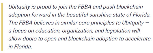 The leader of the blockchain and real estate, Ubitquity LLC has officially announced being a part of the Florida Blockchain Business Association (FBBA), both entities pledge to work together to pursue the common goal to encourage blockchain adoption across Florida.