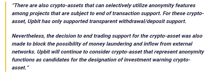 Through its official blog, UpBit clarified that the primary reasons for the delisting of the currencies were to curb the illicit practice of money laundering and reduce the probable risk of inflows of privacy coins from external platforms into the UpBit crypto exchange network.