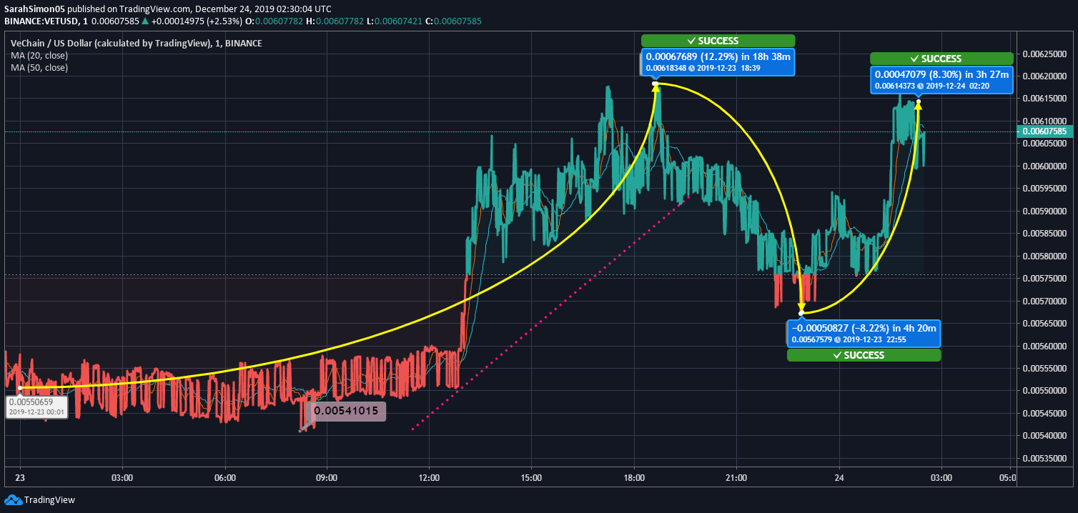 Amidst sluggish movement by most of the major coins, VeChain has shown strength over the last 24 hours. In this period, it has shown three major price swings. The range of the swings lies between $0.0054 and $0.0061.