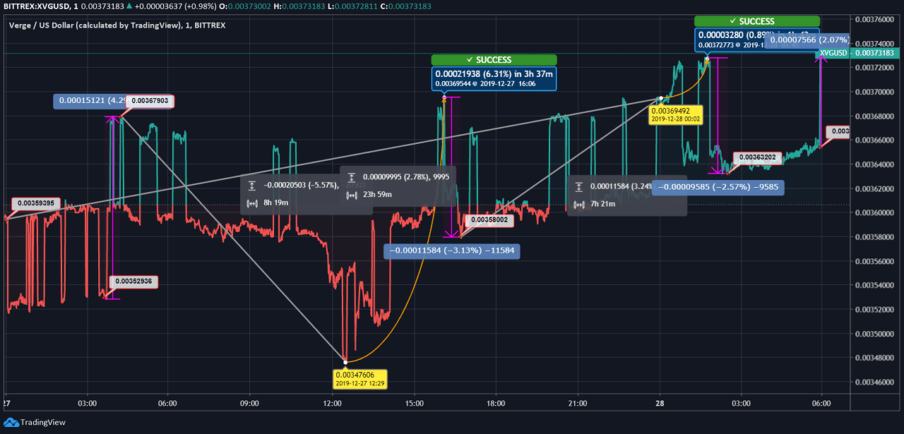 Yesterday, the XVG coin started dealing at $0.00359. Later, the currency escalated to $0.00367 from $0.00352 by 4.25%. Towards the end of the first half of the day, the price slipped to $0.00347 by 5.57%. The currency recovered in the later hour and escalated to $0.00369 by 6.31%. The coin couldn’t hold for long and fell to $0.00358 by 3.13%. The closing hour brought the final escalation and took the Verge price to $0.00369 by 3.24%. The intraday movement in the price reflected a 2.78% progression. Today, the coin price is escalated to $0.00372. The price dropped to $0.00363 by 2.57%. Further, the Verge coin recovered again and moved to $0.00373 from $0.00366 by 2.07%.
