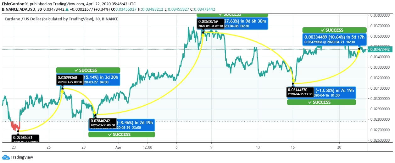 ADA coin has had a good run over the past 30 days, even under volatility, raising the hopes of the investor community. The price was below the baseline on March 23 at $0.0269, but then, it picked up the pace and reached a high of $0.0309 on March 27, registering a hike of 15.14%. After this hike, Cardano reflected downside correction, and over the next two days, the price fell to $0.0285 by 8.46%. Later, the price of ADA coin once again shot up and managed a recovery to the extent of 27.63% and crossed $0.0363 on April 08.