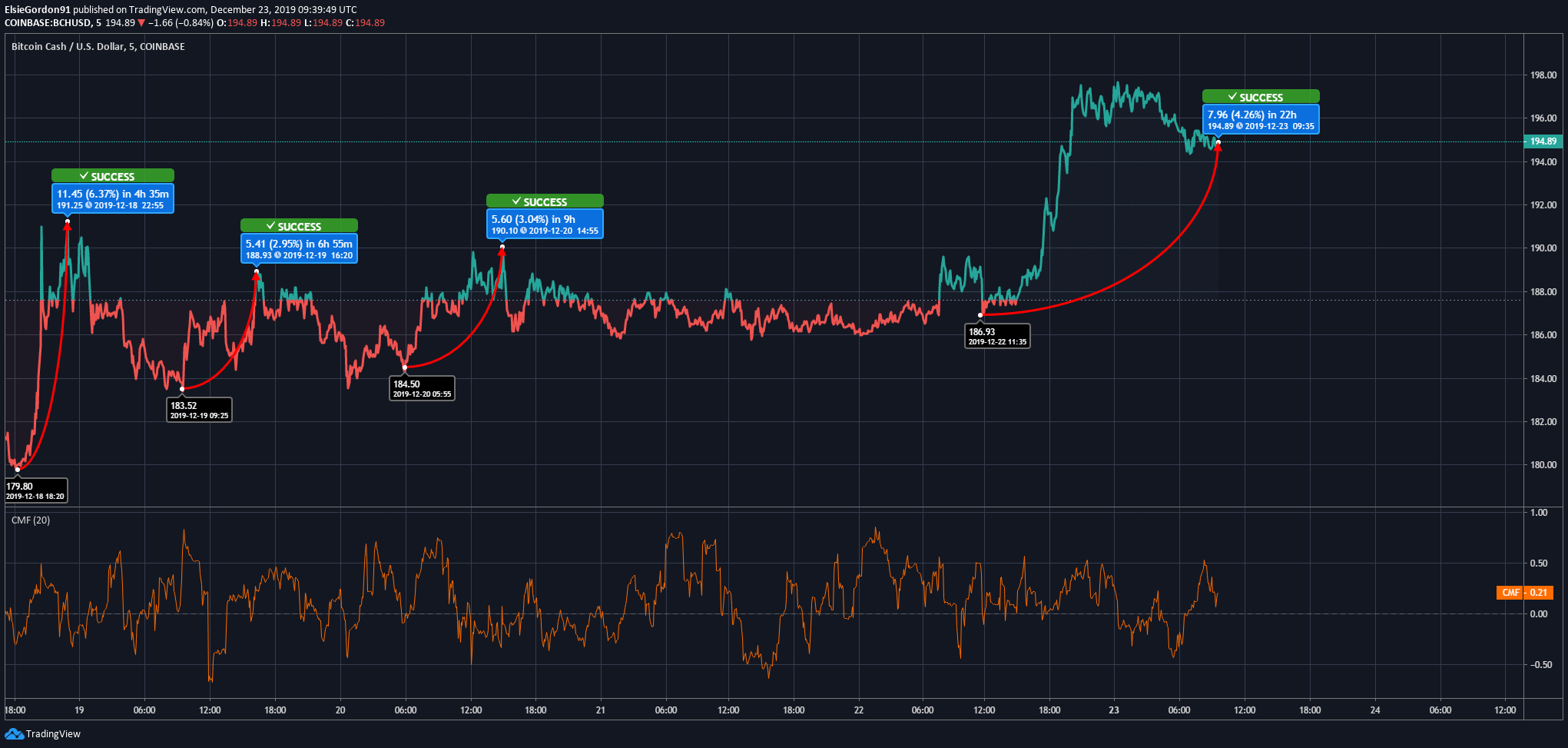 BCH coin was priced $179.80 on December 18, but after a few hours on the same day, the price was escalated to $191.25 with a 6.37% hike. On the next day, Bitcoin Cash price dipped to $183.52 but managed to rise back by almost 3%. On December 20, 2019, the currency managed to show a rise of 3.04% with the price reaching $190.10. For the next two days, the movement of the coin was almost at the same pace with a bearish dominance. From the later part of December 22, 2019, the BCH coin managed to gain back control over the bulls and has been reflecting an upward movement.