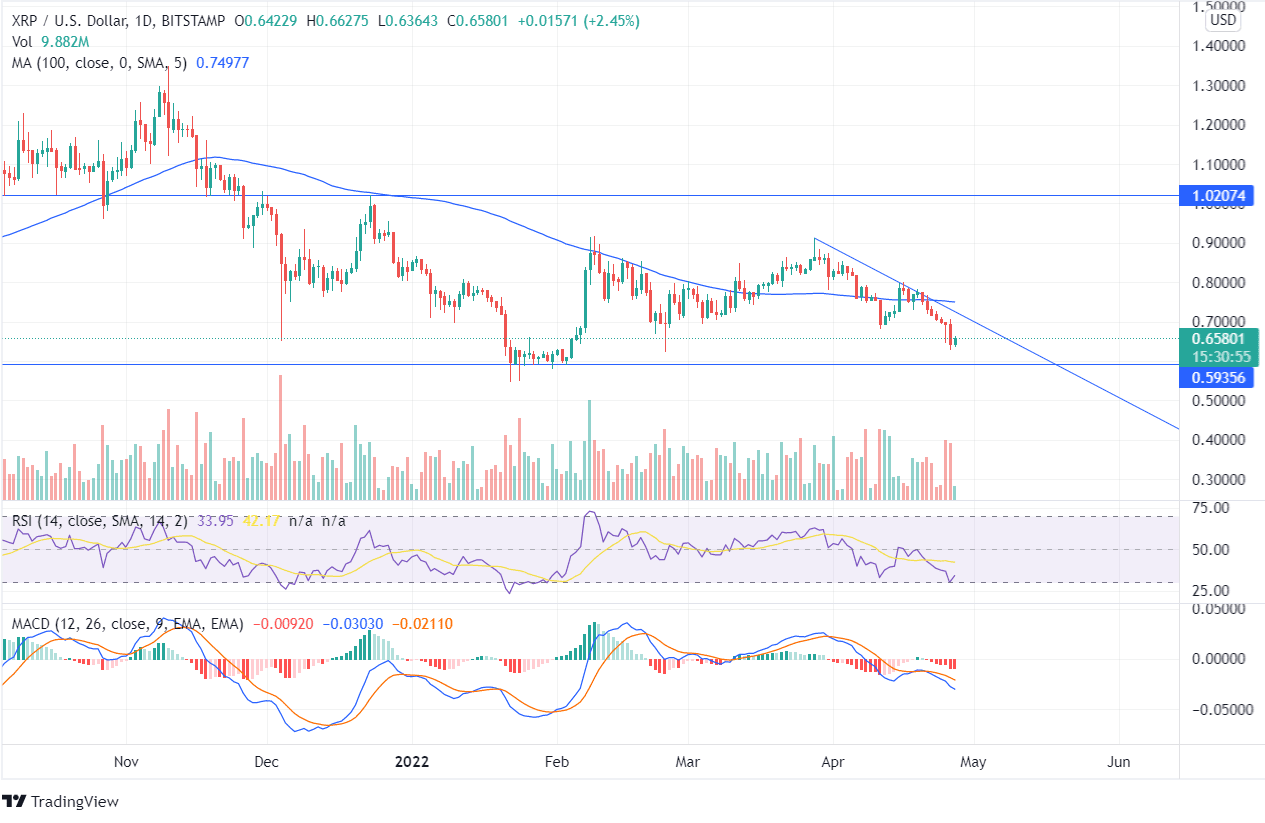 The price trend of XRP has been declining during the past week, and there was a constant formation of lower lows. In the last 4 months, the coin price has been moving in a range-bound area of $1.02 and $0.59. The price could not breach the high of $0.91 even though the bulls had tried to push the coin up.