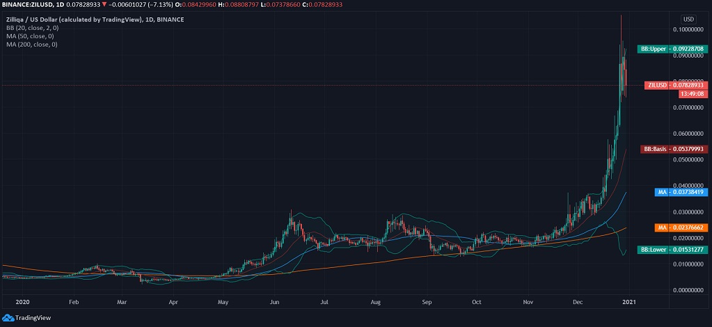 Zilliqa is surrounded by many positive sentiments on Twitter, and with a majority of the investors supporting investments in ZIL, there is a positive reflection of an amplified market cap. With the complete strengthening of the ZIL coin and a steep hike, the crypto has already breached the upper band and currently exhibits a massively volatile movement with an absolute bullish divergence.
